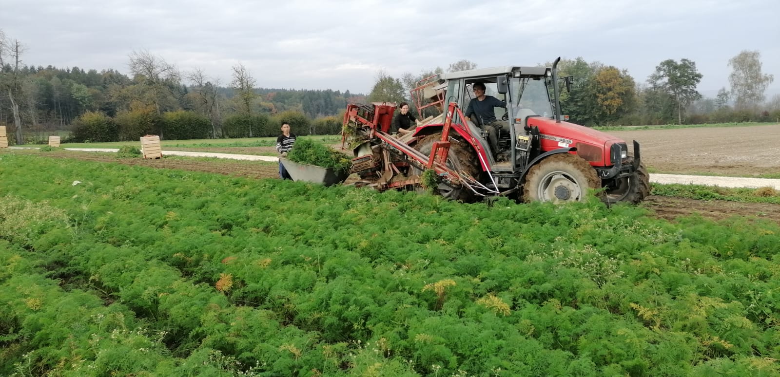 Bei der Ernte im Oktober-November mit unserem mittlerweile auch schon älteren Simon-Vollernter fahren wir jeder Reihe entlang, der Grabarm hebt die Karotten leicht aus dem Boden und mit zwei schräg hochlaufenden Keilriemen, die das Kraut festklemmen, werden die Karottenpflanzen ganz ausgerissen und auf die Verleseebene gehoben. Dort wird das Kraut im Köpfer von den Wurzeln abgequetscht, die Rüebli fallen auf das Verleseband und können von 2-4 Menschen sortiert werden. Im aufwändigen Mattenhofsystem werden die Futterkarotten und die übergrossen auf dem Vollernter und die von der Maschine nicht erfassten Rüebli auf dem Feld in Harassen gesammelt und am Feldende in Paloxen geleert. Und wenn der Boden trocken ist, sammeln wir sogar das Kraut und laden es am Feldende zu einer Made für den Ladewagen ab – die Kühe lieben das aromatische und süsse, gehaltvolle Futter.