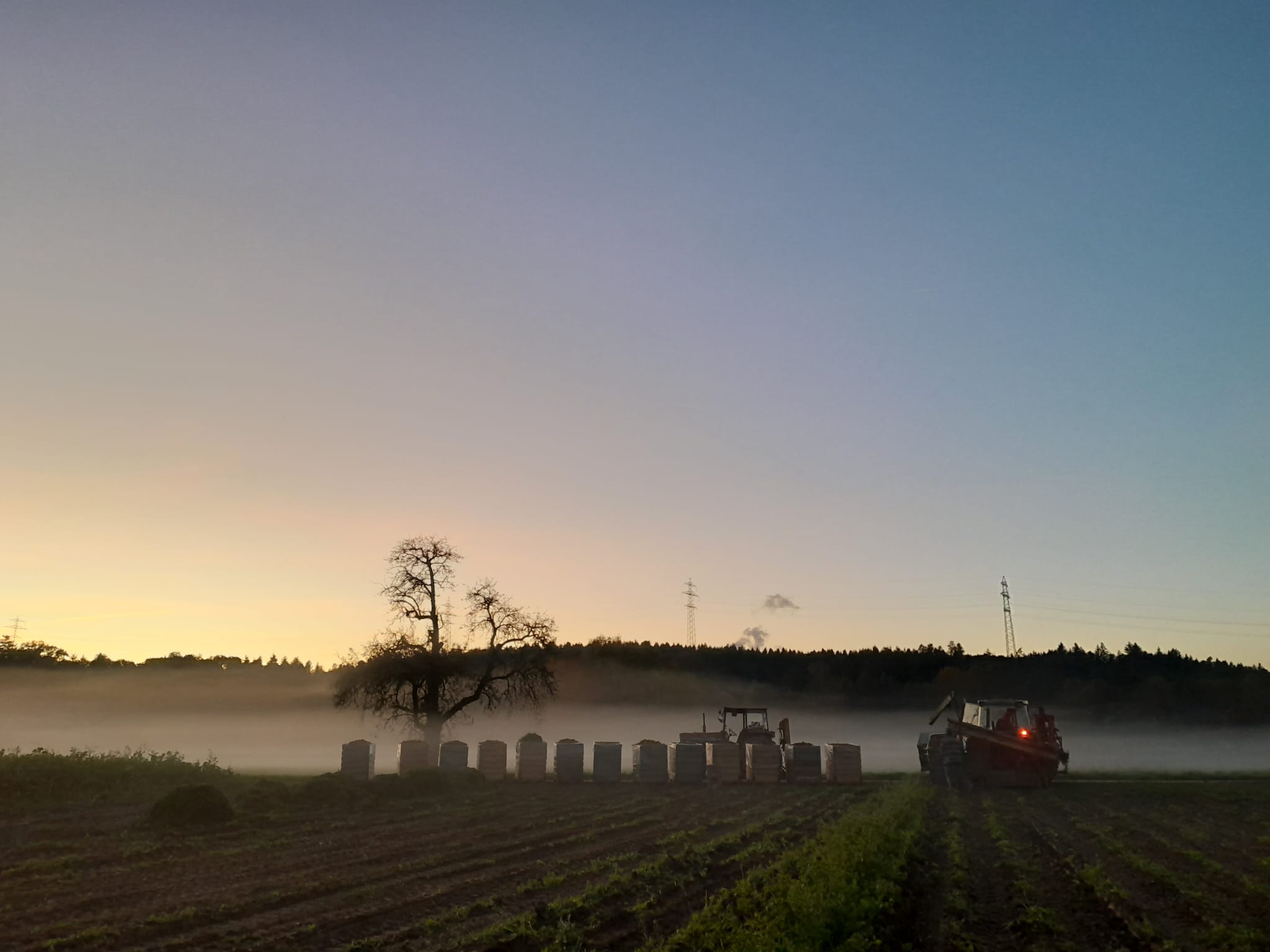 Die Erntezeit ist schön und befriedigend, aber oft auch hektisch. Die Maschine muss fitt sein, Hilfen müssen organisiert werden, Paloxen parat gestellt und am Ende des Tages verräumt werden. Das genaue Manövrieren und umsichtige Bedienen der Maschine, aber auch die Fliessbandarbeit an der Leistungsgrenze während ca. 7 Stunden am Tag machen müde. Mit dem „Mattenhof-System“ schaffen wir 5-10 Paloxen (eine Paloxe fasst gut 500kg Kartoffeln), ca. 10 a pro Tag.