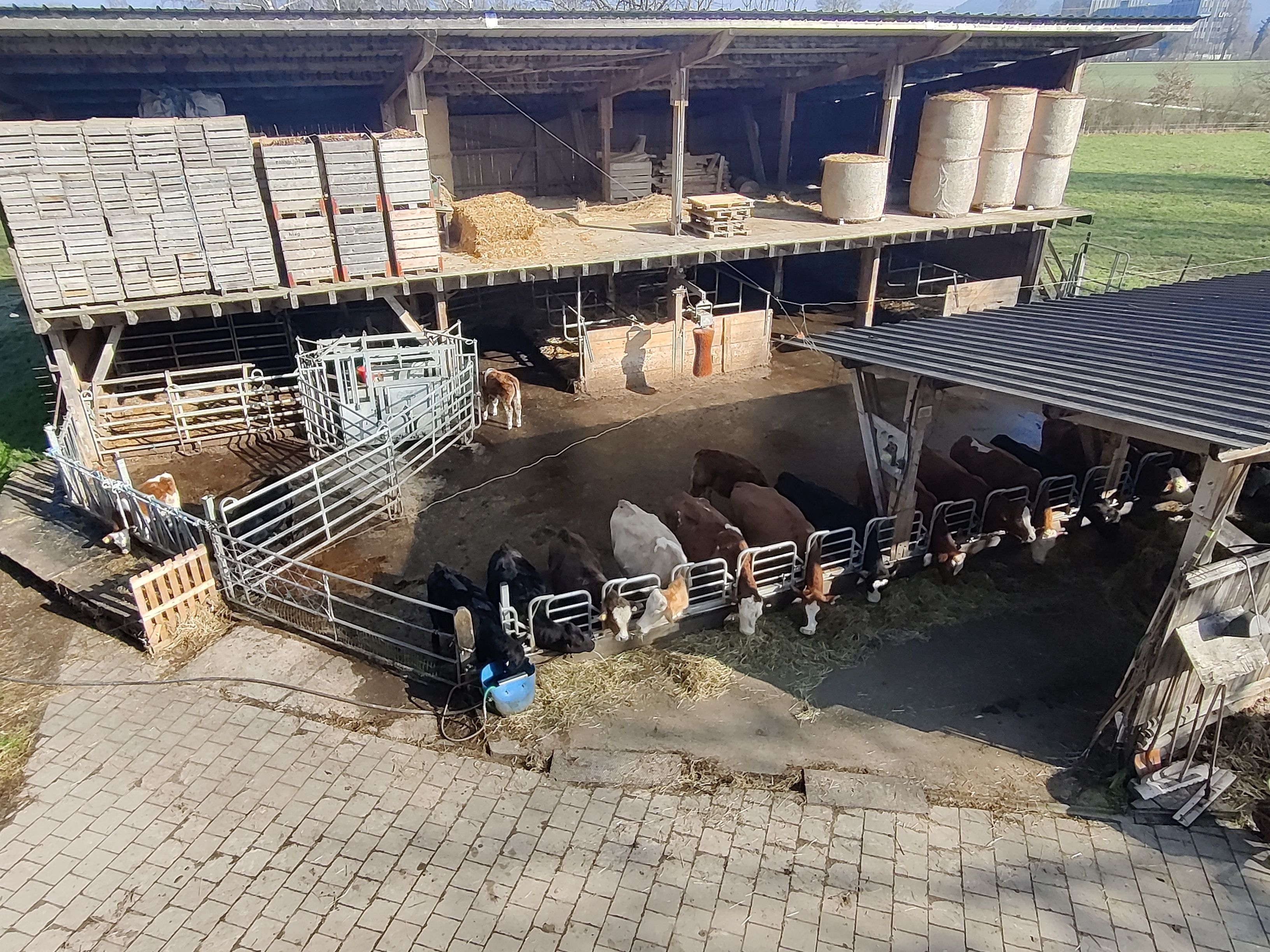 Die Mattenhofherde ist ein Rassengemisch: Reine Simmentalerinnen, eine Anguskuh (Muffin von Kastelen) und Kreuzungen der Rassen Fleckvieh, Limousin, Angus. Wichtig sind für uns nicht eine einheitliche Rasse, dafür eine gute Gesundheit und Fruchtbarkeit der Kuh (jedes Jahr ein Kalb, das auch ohne Geburtshilfe auf die Welt kommt), ein gutes Fundament (das meint in der Fachsprache gesunde Beine und Klauen), eine ausreichende Milchleistung – für das Kalb – und zuletzt natürlich auch ein nicht zu wildes und scheues Tier, damit es für die zahlreichen BetreuerInnen bei uns nicht zu gefährlich wird. Wir möchten einen möglichst hohen Anteil an selber gezüchteten Tieren, weil wir uns so eine ruhigere Herde, die sich und den Stall seit der Geburt kennen, und eine bessere Widerstandsfähigkeit gegen die bei uns üblichen Krankheitserreger erhoffen. Hörner dürfen unsere Tiere tragen, der Stall ist geräumig und das Fressgitter gemacht für behornte Tiere. Wir runden aber die Hornspitzen, weil rangniedere Tiere sonst zu deutliche Striemen im Fell herumtragen. 2024 haben wir das alte, lottrig gewordene Schweden-Fressgitter ersetzt durch den Rolls Royce dieser Art Fangfressgitter in der Schweiz (fressgitter.ch). Mit der Reduktion um 3 Plätze haben jetzt die Kühe Abstände von um die 90 cm und können sich so beim Fressen nicht mehr mit den Hörnern «gusle».